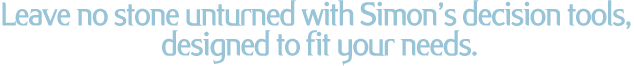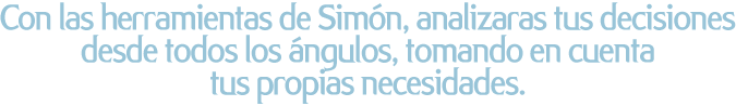 Observa tus opciones de tres maneras diferentes. <strong><em>Mi Calificación</em></strong> es una herramienta buena para decisiones lógicas o decisiones basadas en hechos y que tienen diferentes alternativas. <strong><em>Relación con Mi Vida</em></strong> esta diseñada para decisiones grandes y que pueden cambiar tu vida. Y por último,<strong><em>Mis Puntos de Vista</em></strong> es la herramienta ideal para cuando tienes que tomar una decisión rápida. Averigua que herramienta(s) Simón te aconseja. |