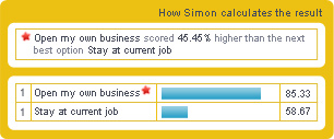 En realidad no es completamente secreto. Tú puedes aprender cómo trabaja el sistema de puntos y también examinar el resumen de análisis de cualquier decisión pública. Si existe un proceso patentado detrás de cada recomendación final que Simón proporciona. Este proceso combina la información cualitativa que suministras con una fórmula matemática ponderada. |